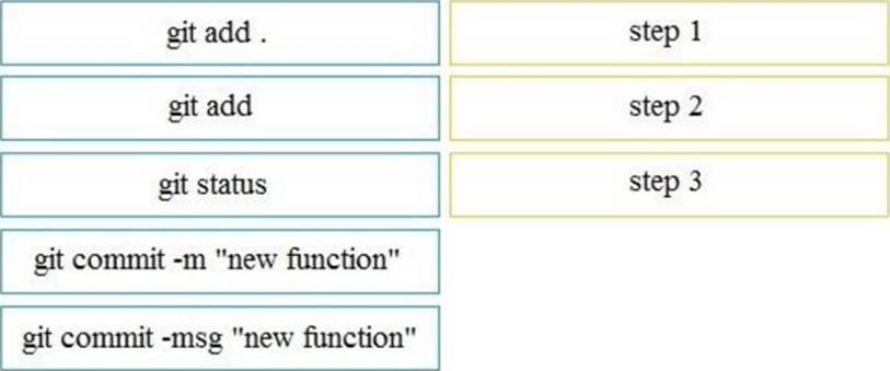 A file named myfunc.py has been edited. Drag and drop the steps from left that ensure that this file is committed to the local Git repository and verify its status into the correct order on the right. Not all options are used.
