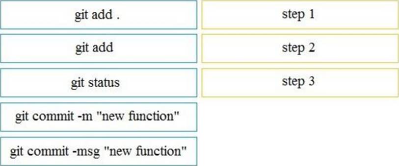 Drag and drop the steps from the left that ensure that this file is committed to the local Git repository and verify its status into the correct order on the right. Not all options are used.