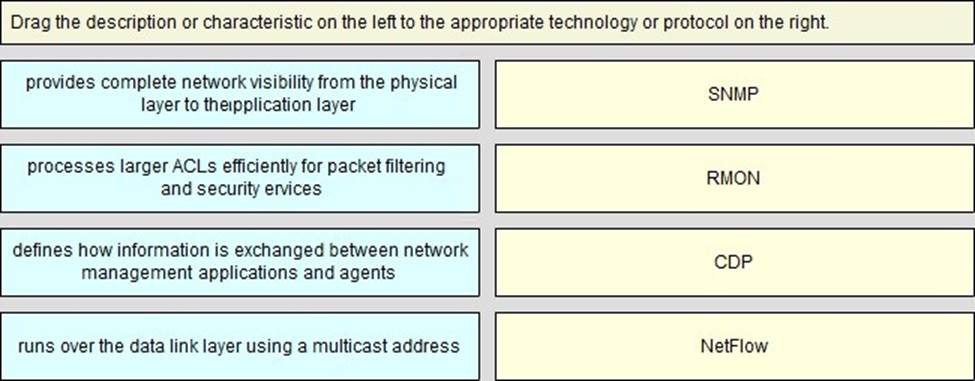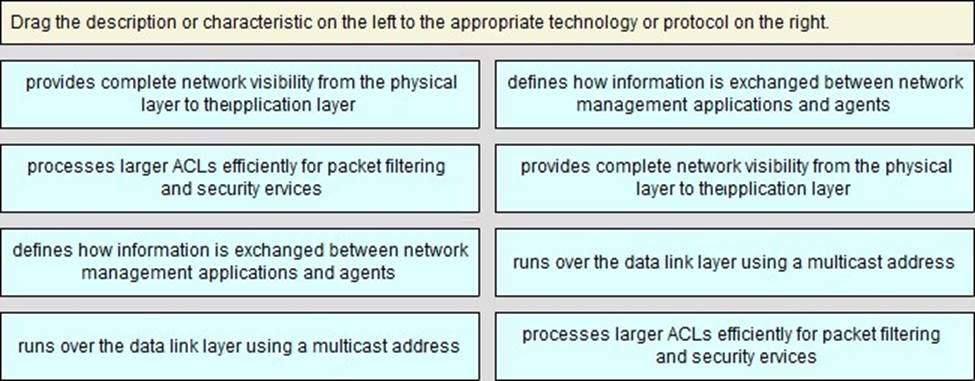 Drag the description or characteristic on the left to the appropriate technology or protocol on the right.