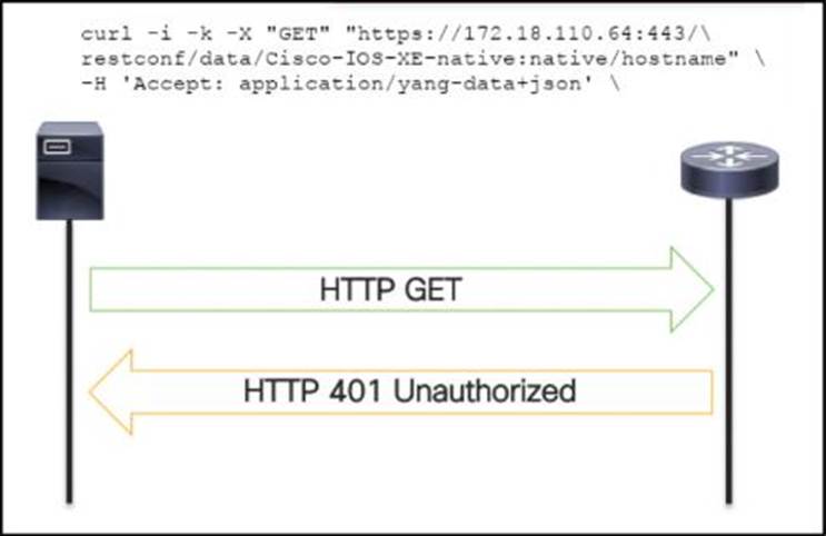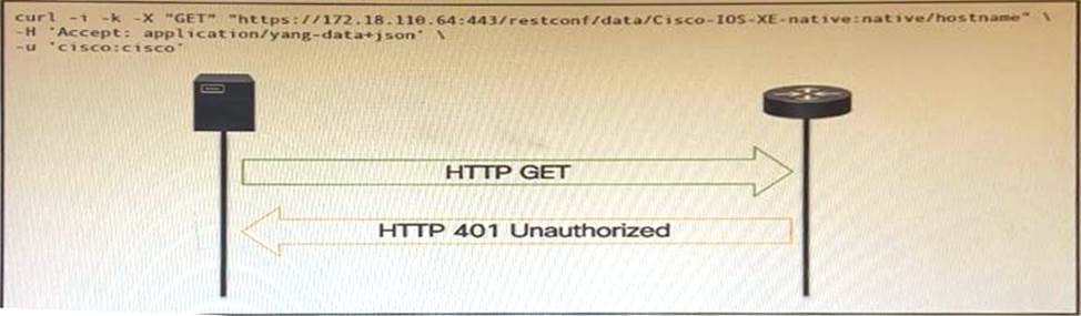 An administrator attempts to perform a GET using the Cisco IOS XE RESTOCNF API to return the hostname of a device. The sequence diagram illustrated the HTTP message observed.
