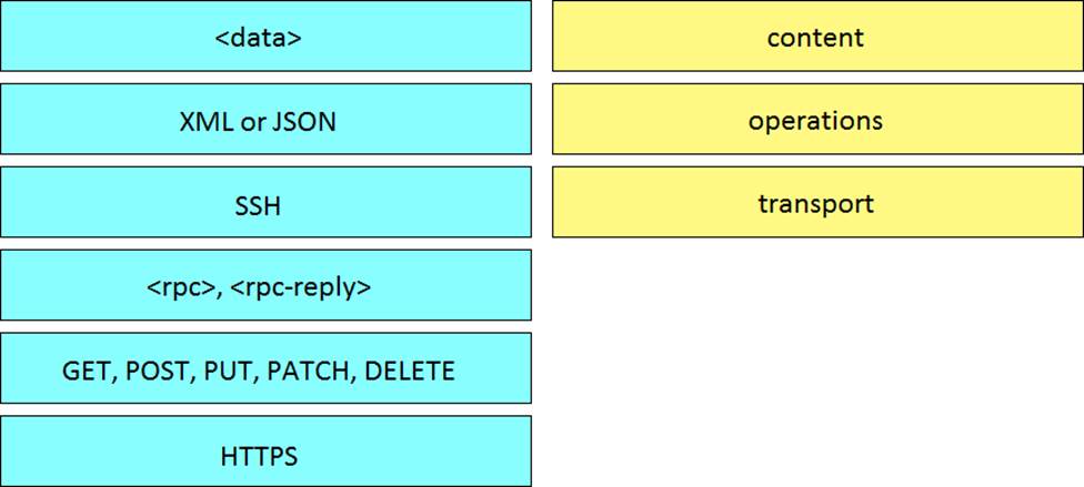 Drag and drop elements of the RESTCONF protocol stack from the left onto the correct description on the right. Not all elements on the left are used.