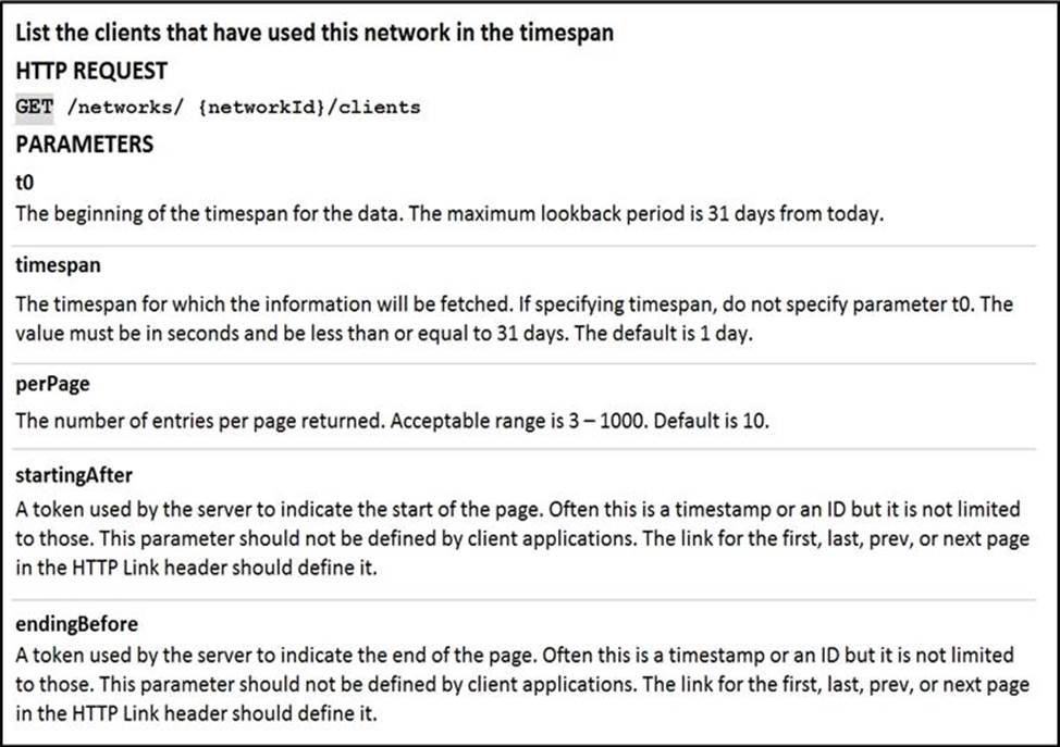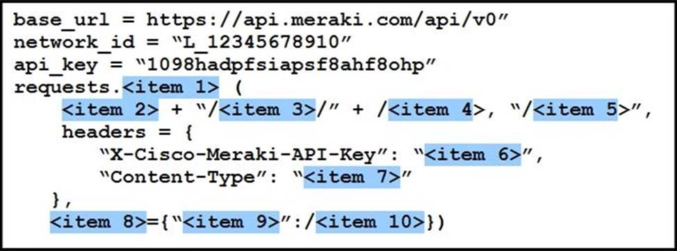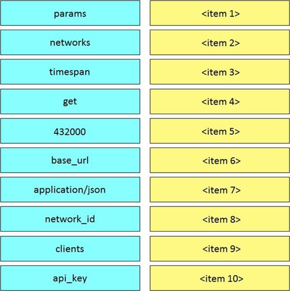 Drag and drop the code from the left code from the left onto the item number on the right to complete the Meraki code to obtain a list of client which have used this network.