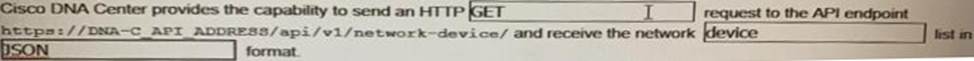 Cisco DNA provide the capability to send an HTTP _______________ request to the API endpoint https://DNA-c_API_ADDRESS/api/vi/network-device/ and receive the network __________ list in __________ format.