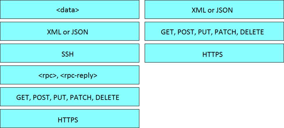 Drag and drop elements of the RESTCONF protocol stack from the left onto the correct description on the right. Not all elements on the left are used.