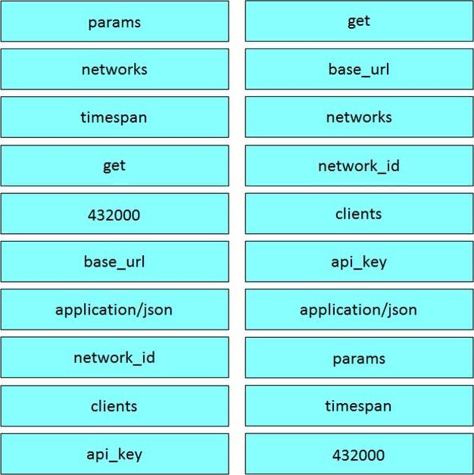 Drag and drop the code from the left code from the left onto the item number on the right to complete the Meraki code to obtain a list of client which have used this network.