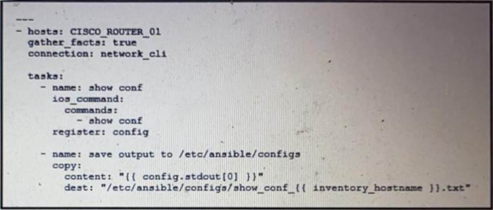 - D . The playbook copies a new running configuration to CISCO_ROUTER_01.