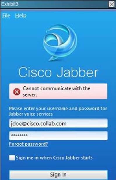 What two issues could be causing the Cisco Jabber failure shown in the exhibit? (Choose two)