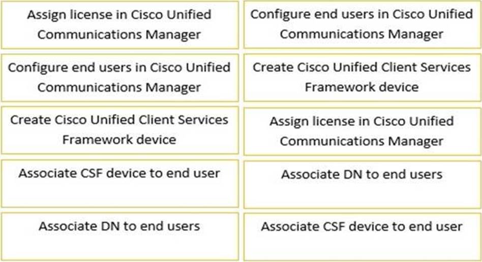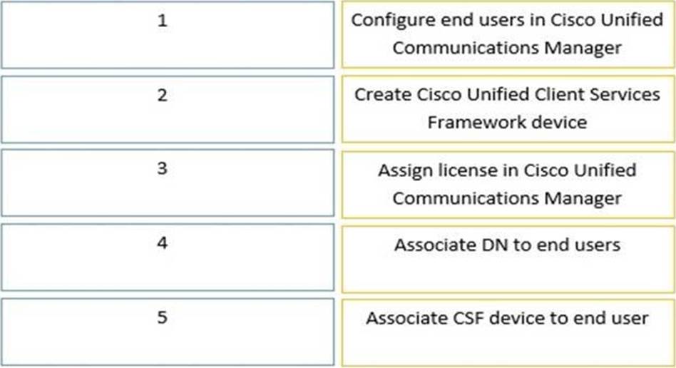 Drag the steps on the left to the correct order on the right for configuring the end user Cisco Unified Personal Communicator.