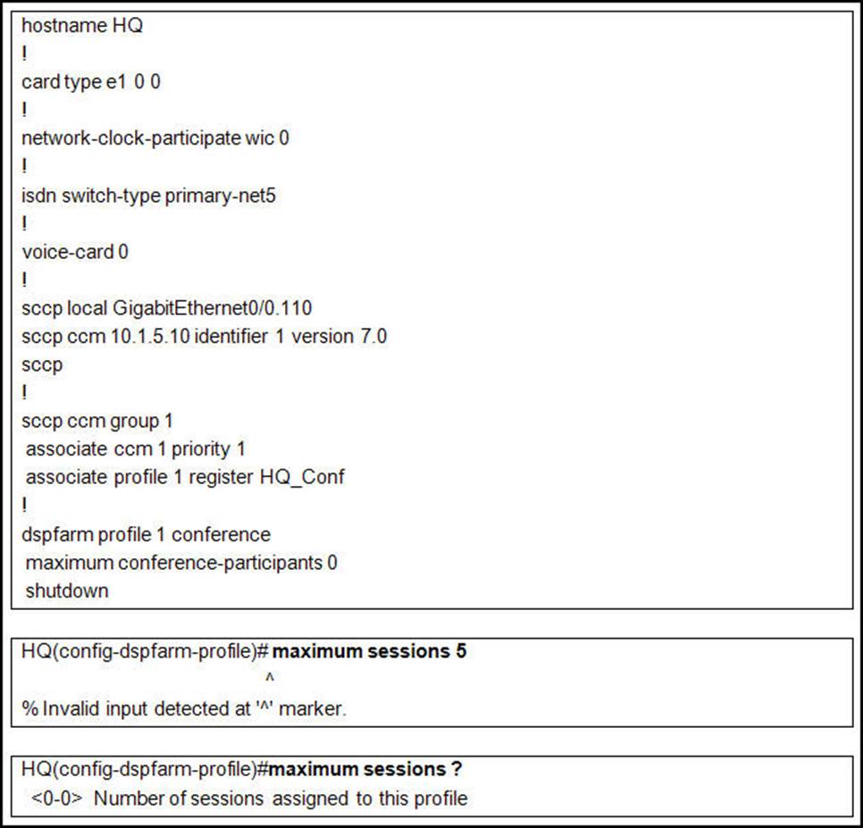 When the user tried to configure the command maximum sessions 5 under the dspfarm profile 1, the error shown in the exhibit was reported.