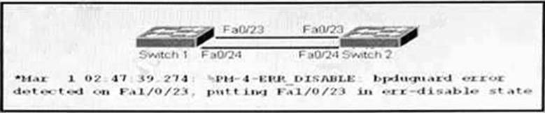- A . disabling BDPU guard on interface Fa0/23 of switch 2