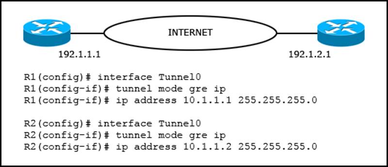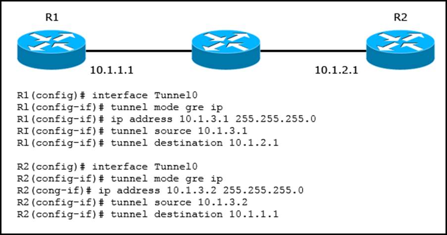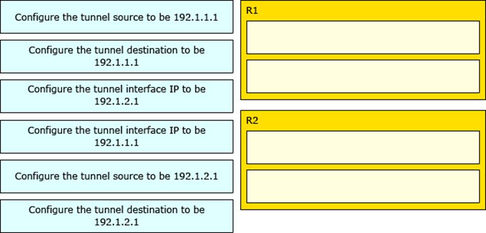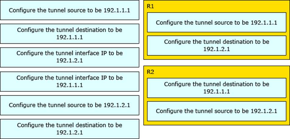 The gre tunnel fails to come up. Drag and drop the configuration from the left onto the corrext routers on the right to resolve the problem. Not all configurations are used.