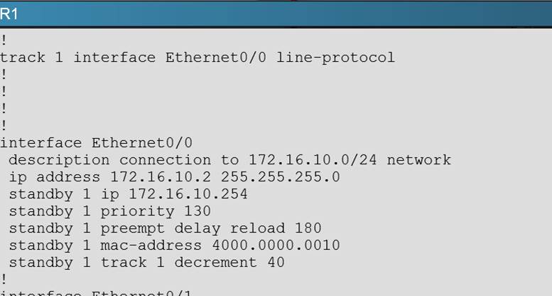 ‘Mar 26 11:17:40.034: HSRP: Et0/0 Grp 1 Hello out 172.16.10.2 Active prj 130 vIP 172.16.10.254