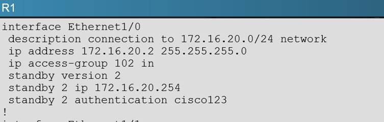‘Mar 26 11:17:41.969: HSRP: Et1/0 Grp 2 Hello out 172.16.20.2 Active pri 100 vIP 172.16.20.254 172.16.20.254