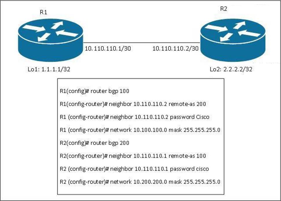- B . An incorrect neighbor AS number is configured on router R1 for router R2.
