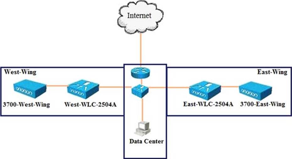 There is a problem with the East-WLC-2504A. When configuration changes are made to the Employees-East-Wing AP Group that covers the East-Wing, none of the APs receive the updates. Referto the exhibits to determine where the problems are.