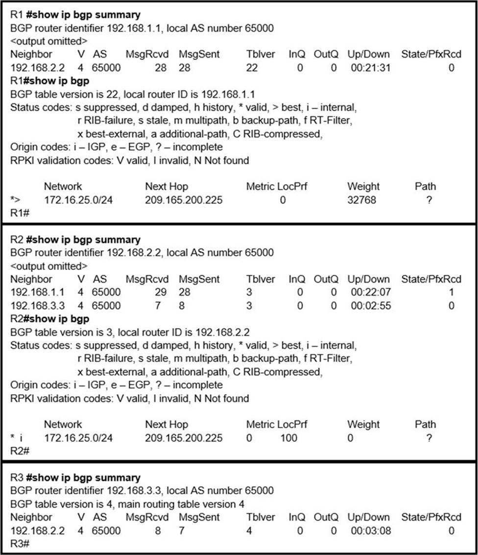 R2 is a route reflector, and R1 and R3 are route reflector clients. The route reflector learns the route to 172.16.25.0/24 from R1, but it does not advertise to R3.