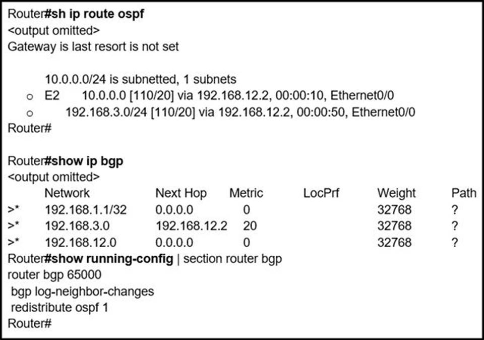- A . By default, only internal routes and external type 1 routes are redistributed into BGP