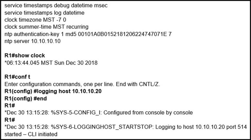 An administrator noticed that after a change was made on R1, the timestamps on the system logs did not match the clock.
