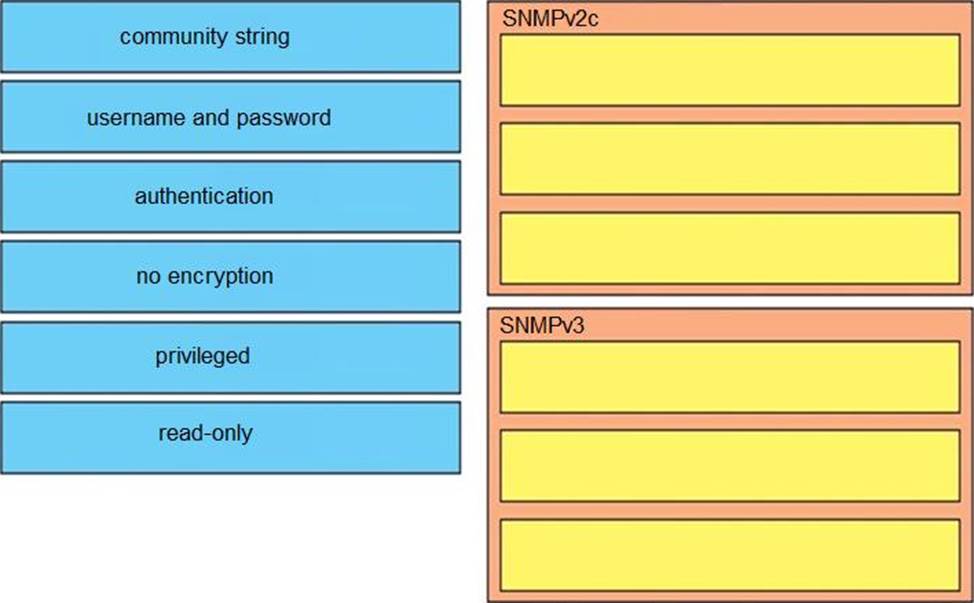 Drag and drop the SNMP attributes in Cisco IOS devices from the left onto the correct SNMPv2c or SNMPV3 categories on the right.