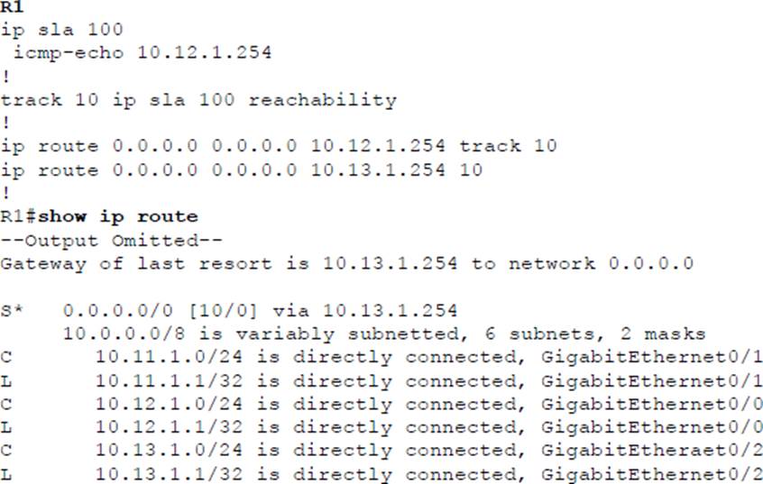 An engineer is monitoring reachability of the configured default routes to ISP1 and ISP2. The default route from ISP1 is preferred if available.