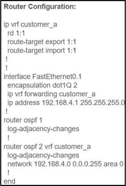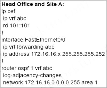 An engineer configured a company’s multiple area OSPF head office router and Site A cisco routers with VRF lite. Each site router is connected to a PE router of an MPLS backbone.