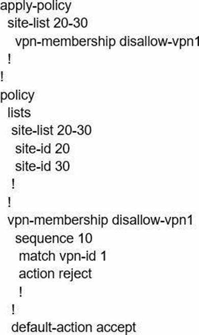 When the VPN membership policy is being controlled at the vSmart controller, which policy disallows VPN 1 at sites 20 and 30?
