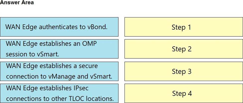 Drag and drop the steps WAN Edge performs when on-boarded into the Cisco SD-WAN overlay from the left into the order they are completed on the right.