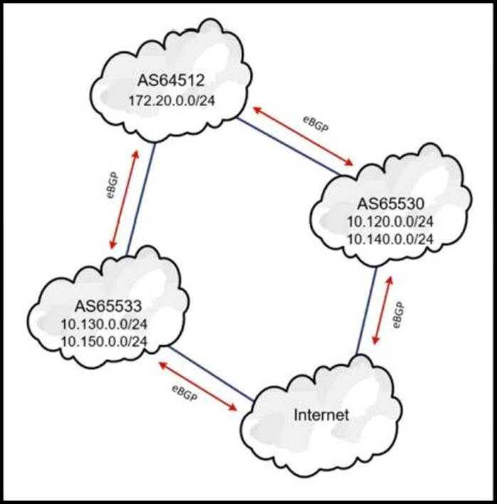 AS65533 and AS65530 are announcing a partial Internet routing table as well as their IP subnets. An architect must create a design that ensures AS64512 become a transit AS.