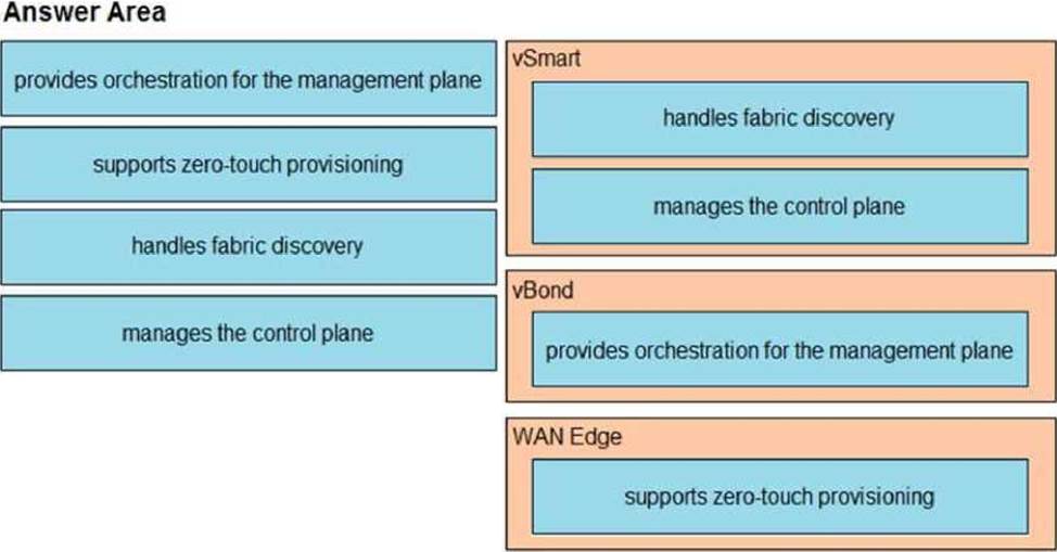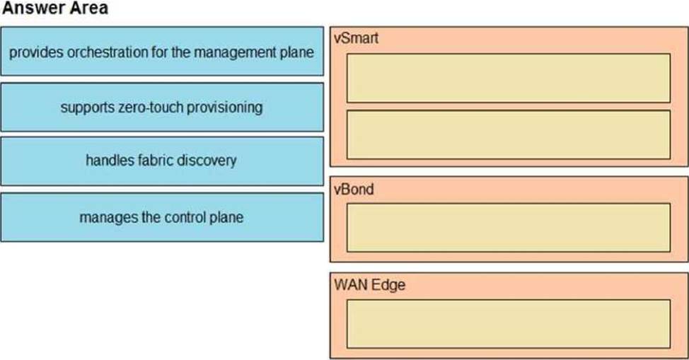 Drag and drop the properties from the left onto the Cisco SD-WAN components that perform them on the right.
