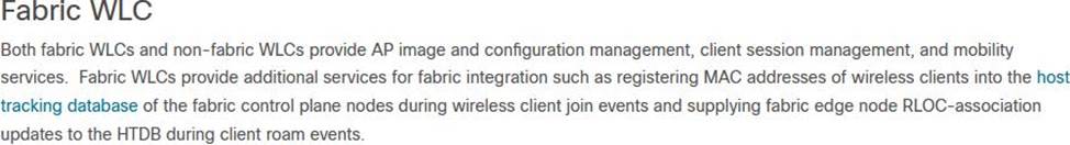 - B . Fabric WLCs update the HTDB as new clients connect to the wireless network