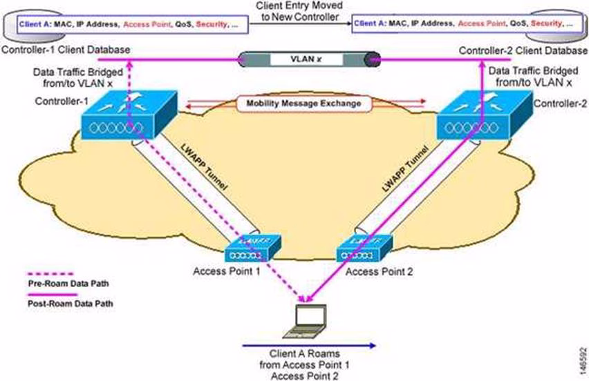 - A . Controllers exchange mobility control messages (over UDP port 16666) and the client database entry is moved from the original controller to the new controller.