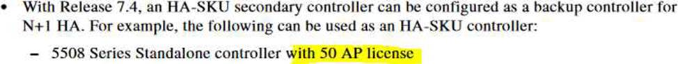 - B . The secondary Cisco WLC needs a minimum of 50 base licenses