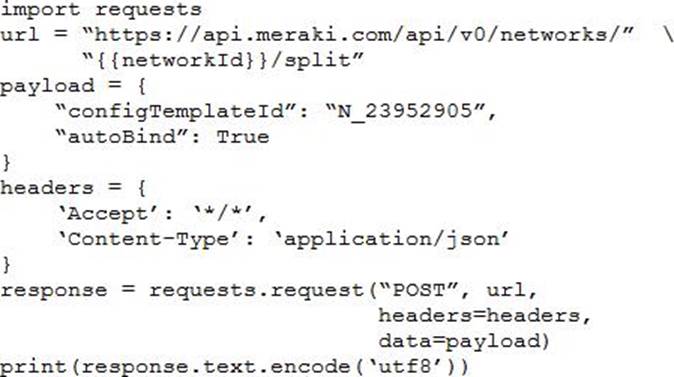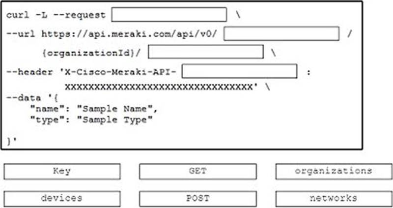Drag and drop the code snippets from the bottom onto the blanks in the code to create a network for a new Cisco Meraki organization. Not all option are used?