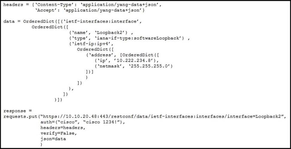 A Python script is used to configure a Cisco IOS XE router. The Loopback2 interface currently has a description of Management and an IP address/netmask of 10.222.34.22/32.