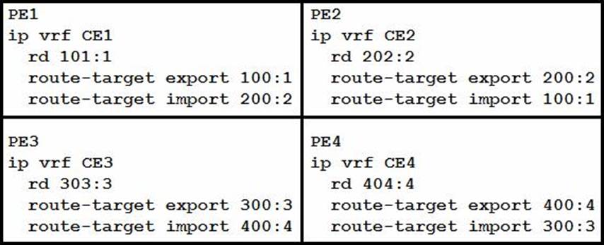 A network engineer has been called to configure the four PE devices in order to enable full communication among the four CE devices connected to them. While starting to configure, he experienced a connectivity issue .