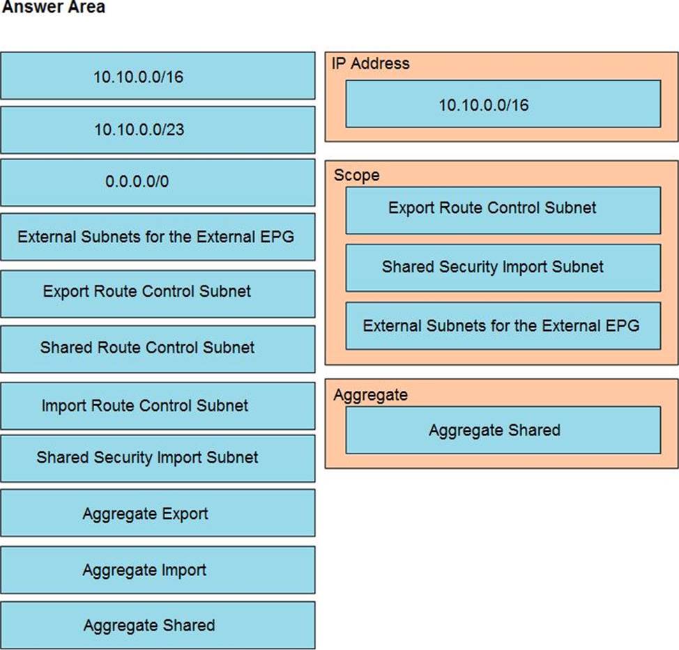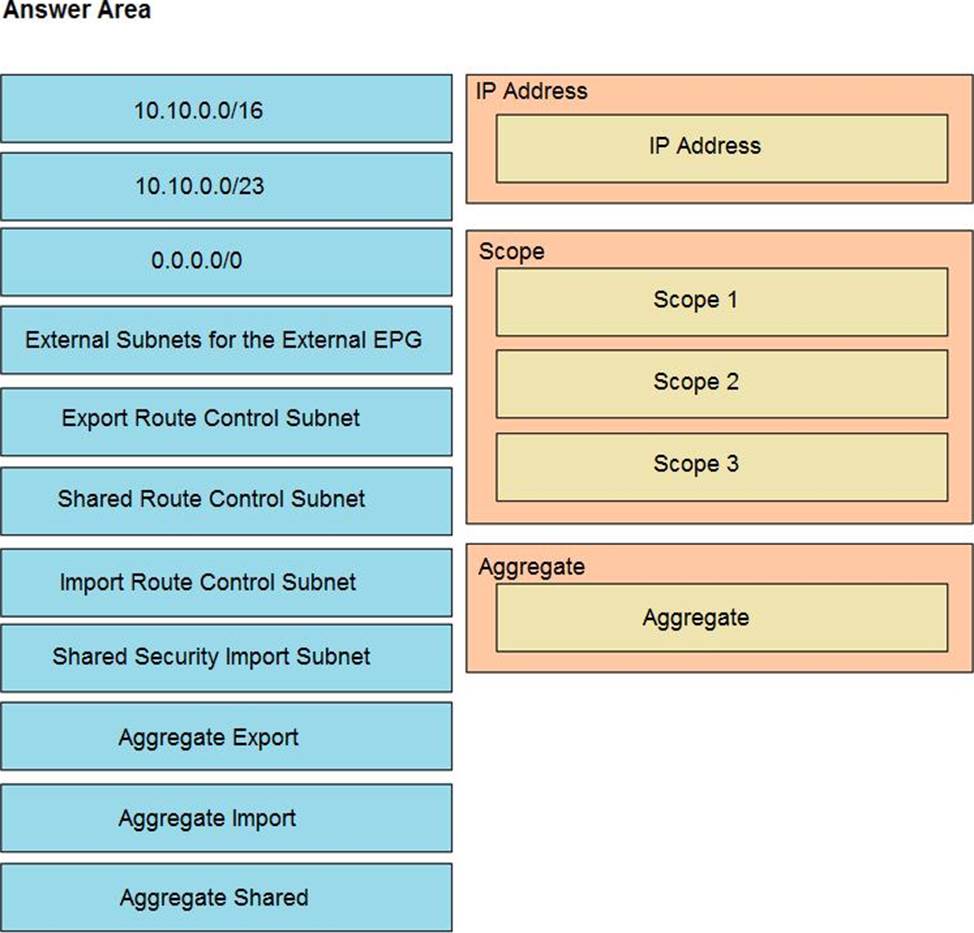 Refer to the exhibit. Drag and drop the subnets and flags from the left into the External Network Instance Profile policies on the right to create a setup that advertises only 10.10.0.0/24 and 10.10.1.0/24 prefixes in VRF1 and establishes connectivity between VRFs. Not all options are used.