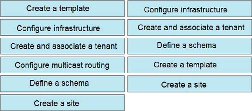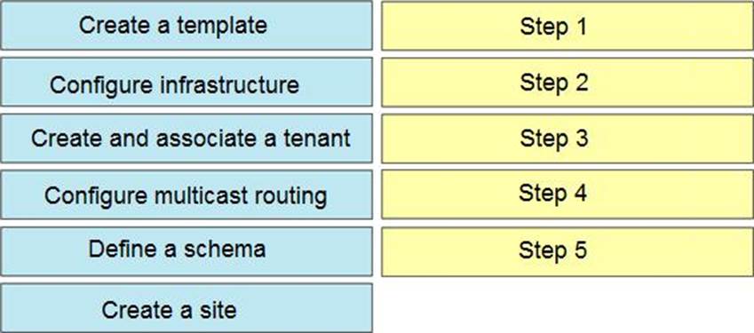 Drag and drop the actions from the left into the steps on the right to add a site and deploy new Cisco ACI objects to the fabric. Not all actions are used.