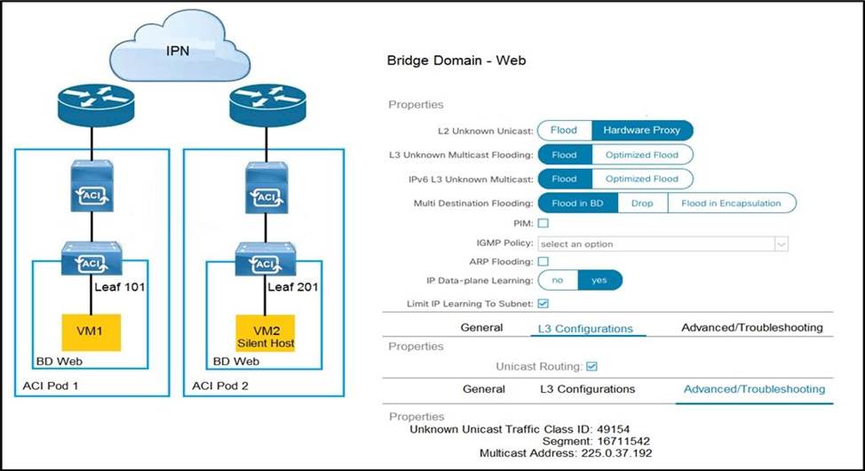 - B . POD1 spine responds to the ARP request after the POD1 COOP is updated with the VM2 location.