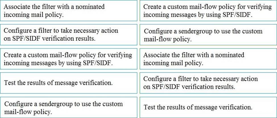 Drag and drop the steps to configure Cisco ESA to use SPF/SIDF verification from the left into the correct order on the right.