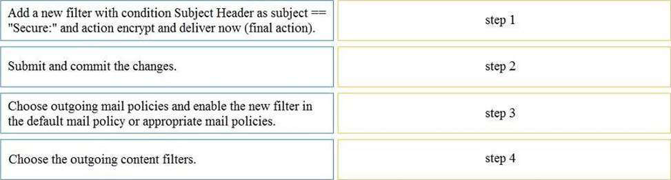 Drag and drop the steps from the left for creating an outgoing content filter to encrypt emails that contains the subject "Secure:" into the correct order on the right.
