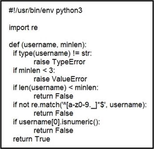 - A . modify code to return error on restrictions def return false_user(username, minlen)