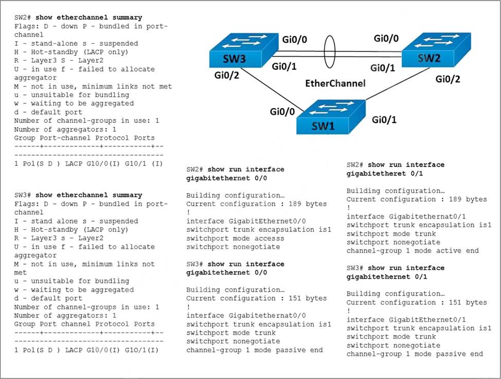 - B . Configure the channel-group mode on SW3 Gi0/1 to active