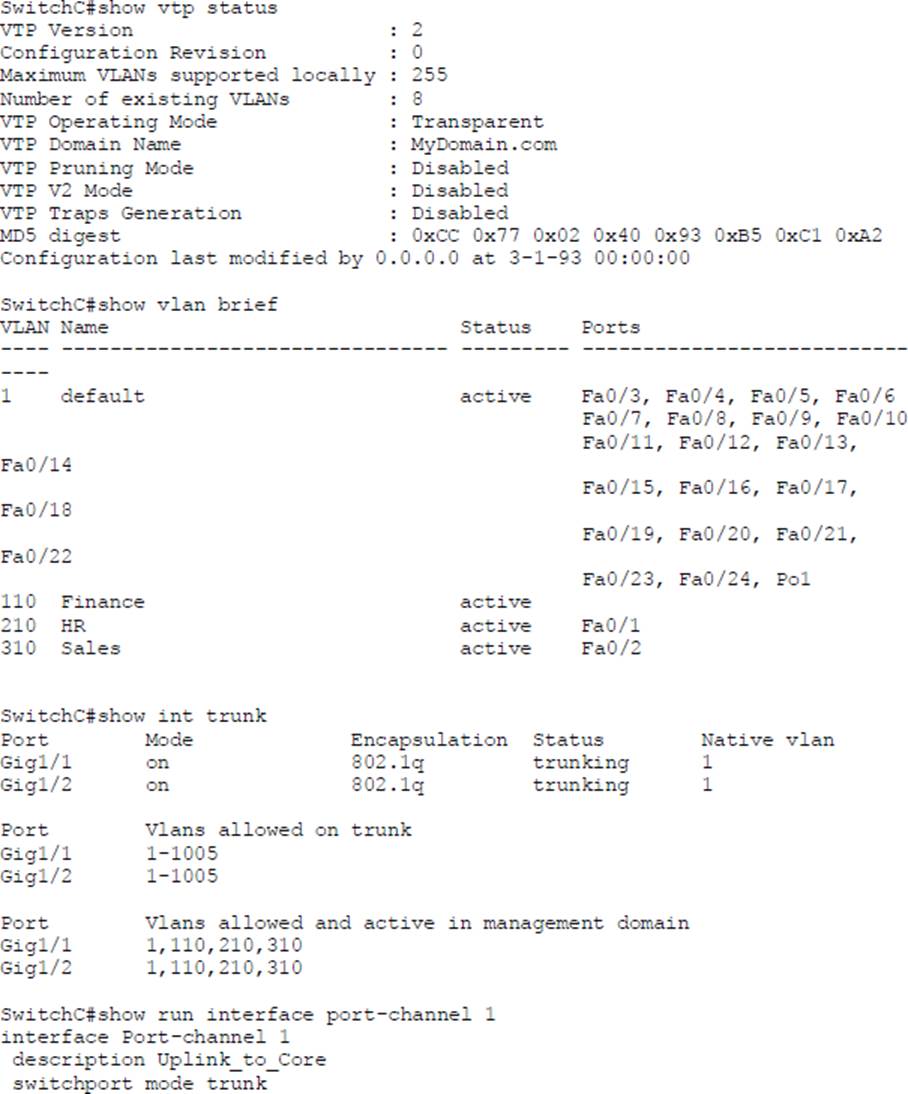 SwitchC connects HR and Sales to the Core switch However, business needs require that no traffic from the Finance VLAN traverse this switch.