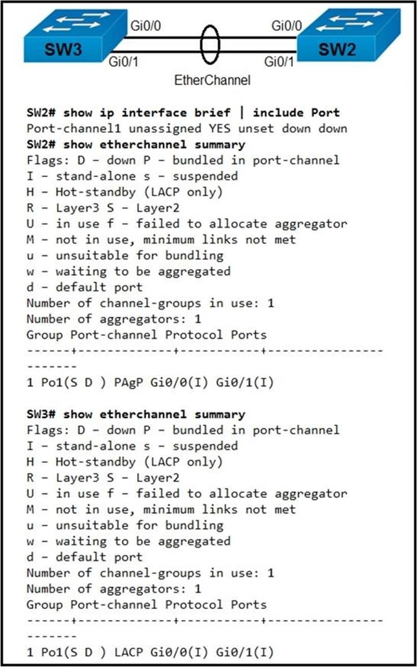 Which action resolves the EtherChannel issue between SW2 and SW3?