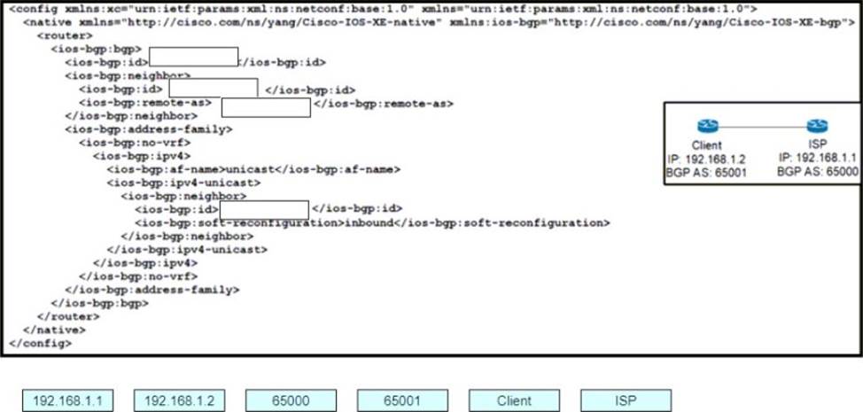Drag and drop the snippets onto the blanks within the code to construct a script that configures BGP according to the topology. Not all options are used, and some options may be used twice.