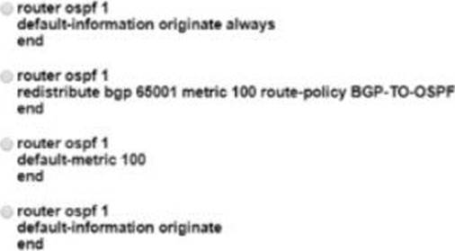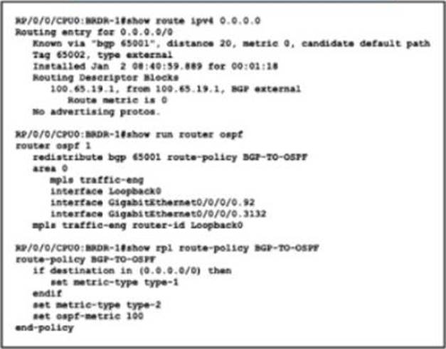 Router BRDR-1 is configured to receive the 0.0.0.0/0 and 172.17.1.0/24 network via BGP and advertise them into OSPF are 0. An engineer has noticed that the OSPF domain is receiving only the 172.17.1.0/24 route and default route 0.0.0.0/0 is still missing.