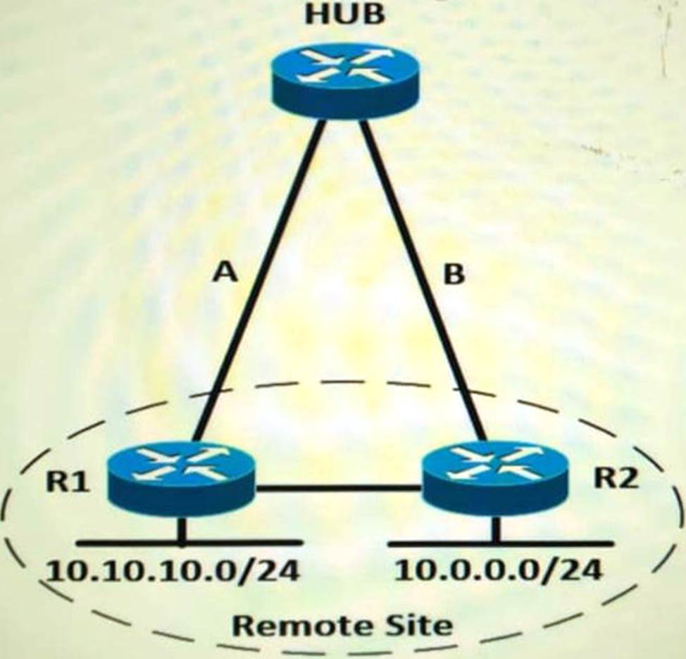 A customer runs EIGRP and has remote routers with EIGRP stub configured. The customer tests the redundancy by shutting down the B link, and surprisingly the 10.0.0.0/24 subnet is no longer accessed by the hub router.