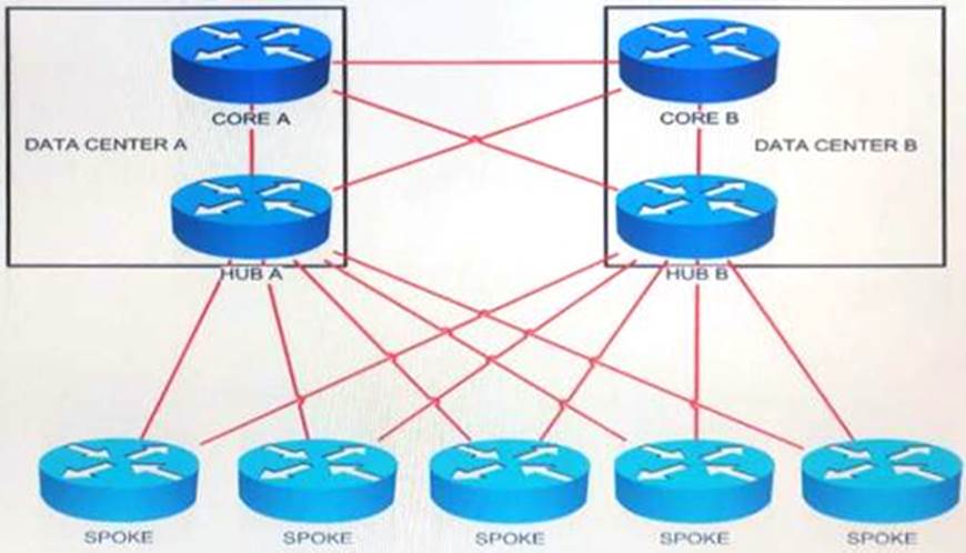 You must ensure that both A and core B devices have only the minimum information required for reaching the spoke routers, yet maintain full reachability during network failures.