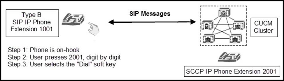 - C . As soon as the user selects the Dial softkey, the SIP IP phone will forward all digits to Cisco Unified Communications Manager in a SIP INVITE message. Cisco Unified Communications Manager will extend the call as soon as the collected digits match the extension of the SCCP IP phone, bypassing class of service configuration on both IP phones.