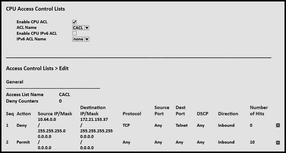 - F . This CPU ACL is used as a redirection ACL to redirect all traffic, except Telnet to 172.21.153.37.